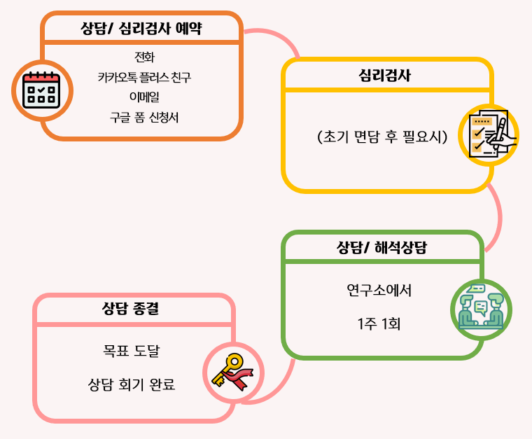 (1) 상담 예약 : 전화/카카오톡 플러스 친구/이메일/구글 폼(신청서)으로